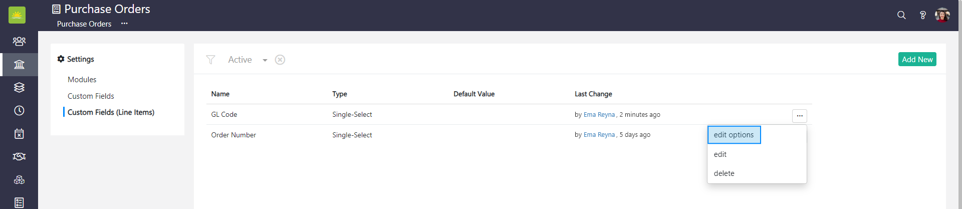 To edit options for a custom field (Line Items), click Custom Fields (Line Items) in the top left corner of the Settings window. Click … at the end of the row of the chosen item and click edit options.