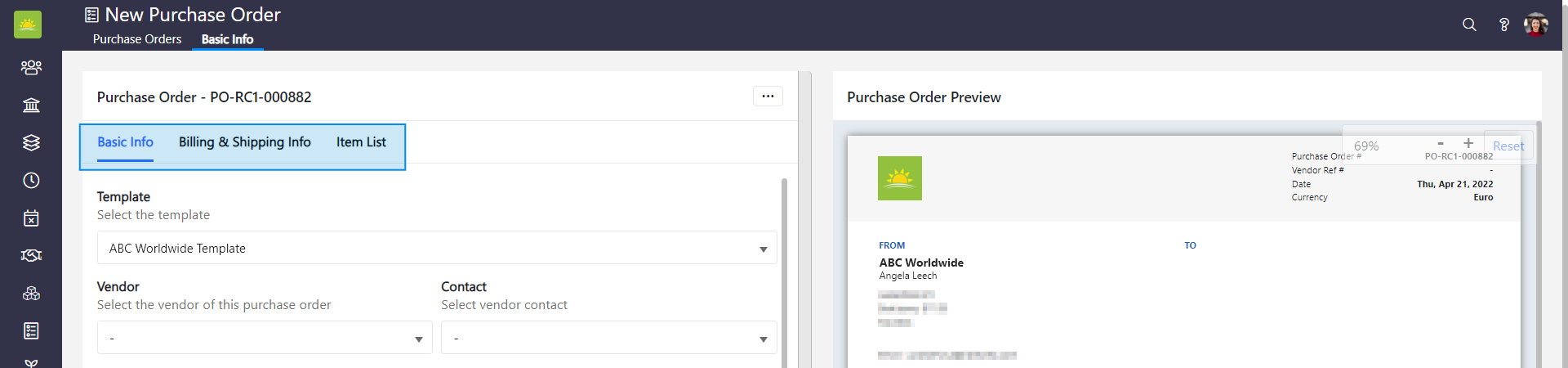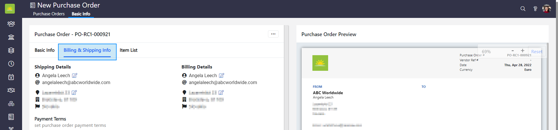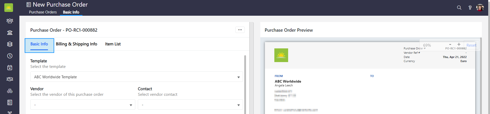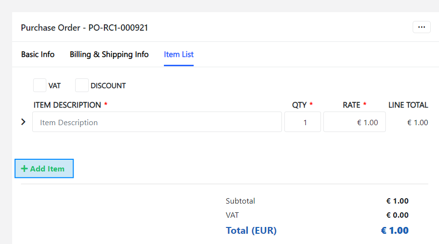 When you create a new purchase order, you need to enter the following information: Basic Info, Billing & Shipping Info, and Item List. Basic info includes information about the vendor, purchase order requester, key dates, currency, what the purchase order is for, and more. You can add comments and notes if required. You will also need to edit the Billing & Shipping details for this purchase order and set its payment terms. The Item List allows you to apply VAT and any discounts. As you add an item description, quantity, and rate, the system will generate the subtotal and total value for the purchase order.