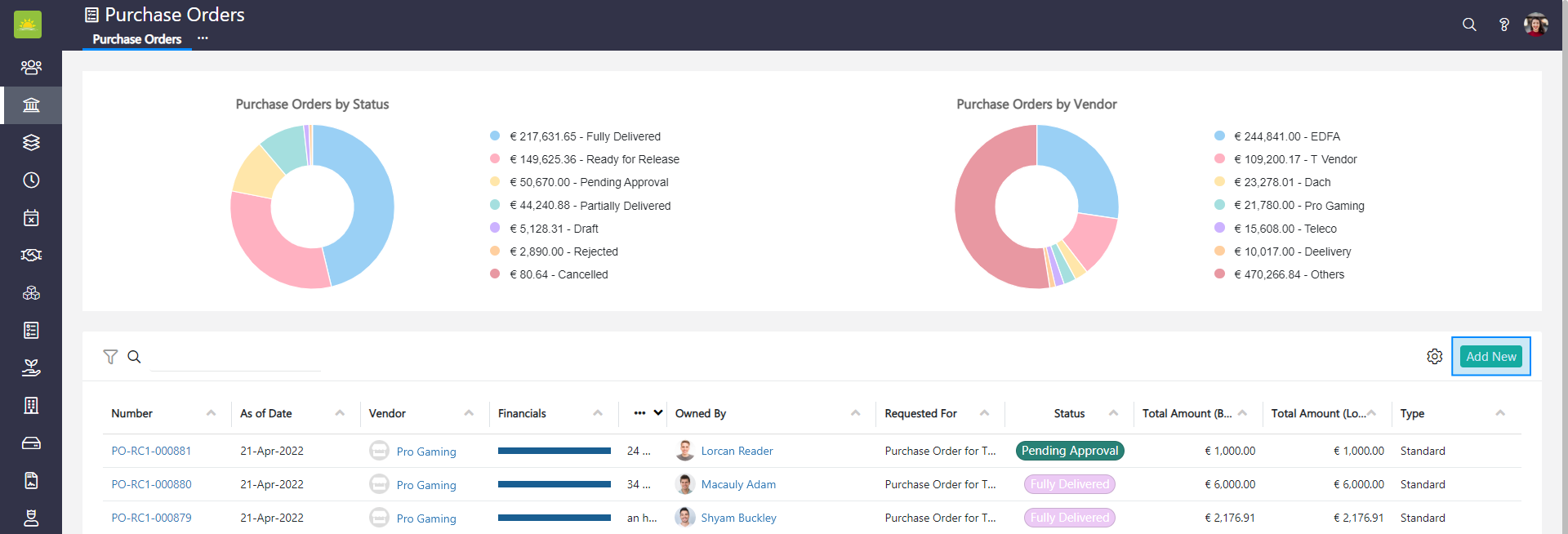 When you create a new purchase order, you must fill in the purchase order’s basic info. Go to the Finance module and click the Purchase Orders module. Click Add New in the top right corner.