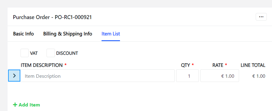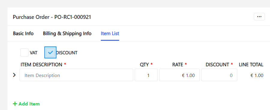 By default, VAT and Discount are disabled. It can be enabled by ticking the field based on the requirements of the purchase order.