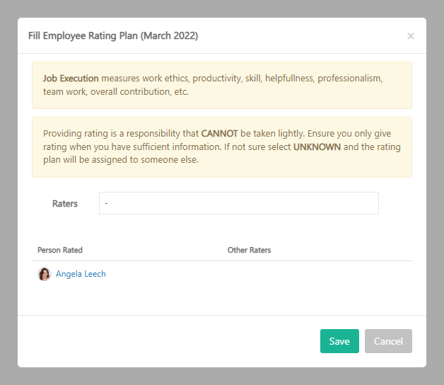 - Raters – Raters are personnel that have been assigned to give an evaluation rating on a personnel's job execution at work. The personnel must have a payroll active in Vault Synapse for the given month. From this modal window you can only select one rater. The rater can later see the person they're evaluating on their own global dashboard.
