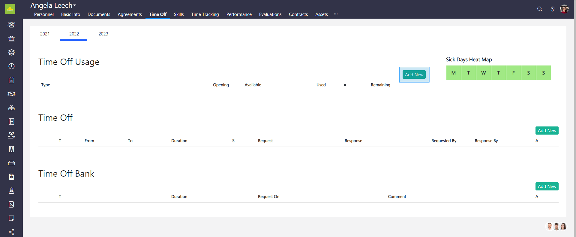 To add a new time off usage template, go to the Personnel module and click the Time Off tab inside a personnel's page.