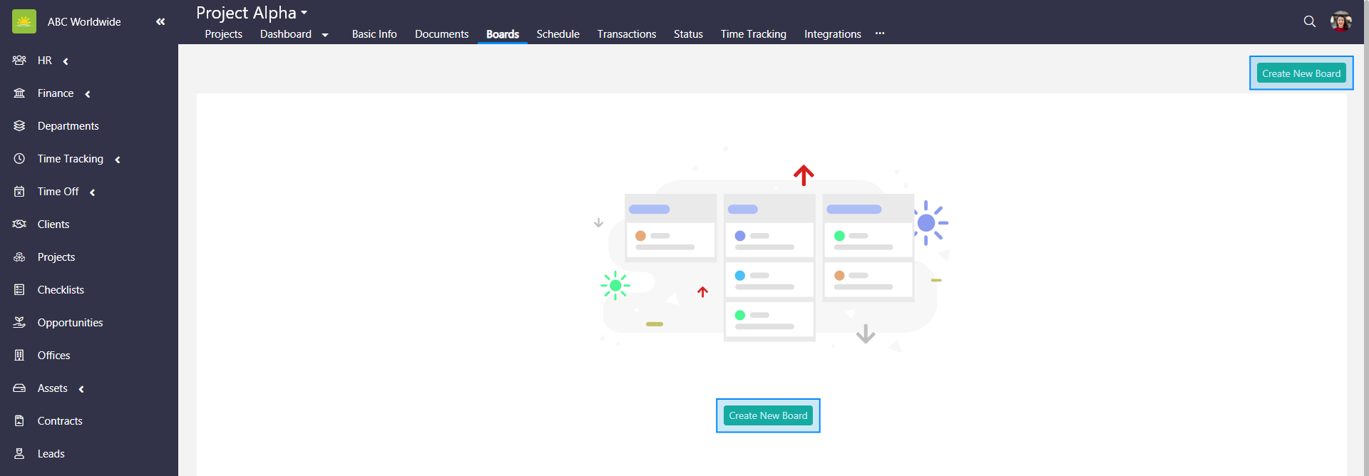 To create a new board, go to the Projects module and click the Boards tab inside of a specific project. Find the project you wish to add a board to. Click the link to find out how to search for a project.