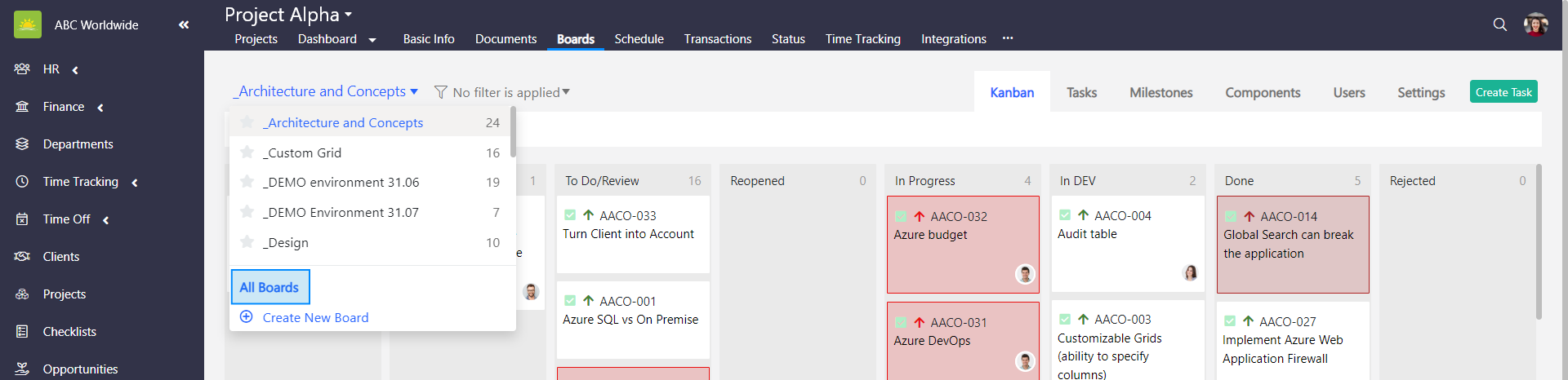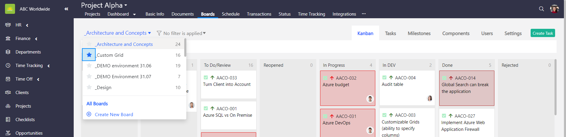 To set up a default board, go to the Projects module and click the Boards tab inside of a specific project. Boards can also be opened directly from the projects grid by clicking on the number in the Boards columns.