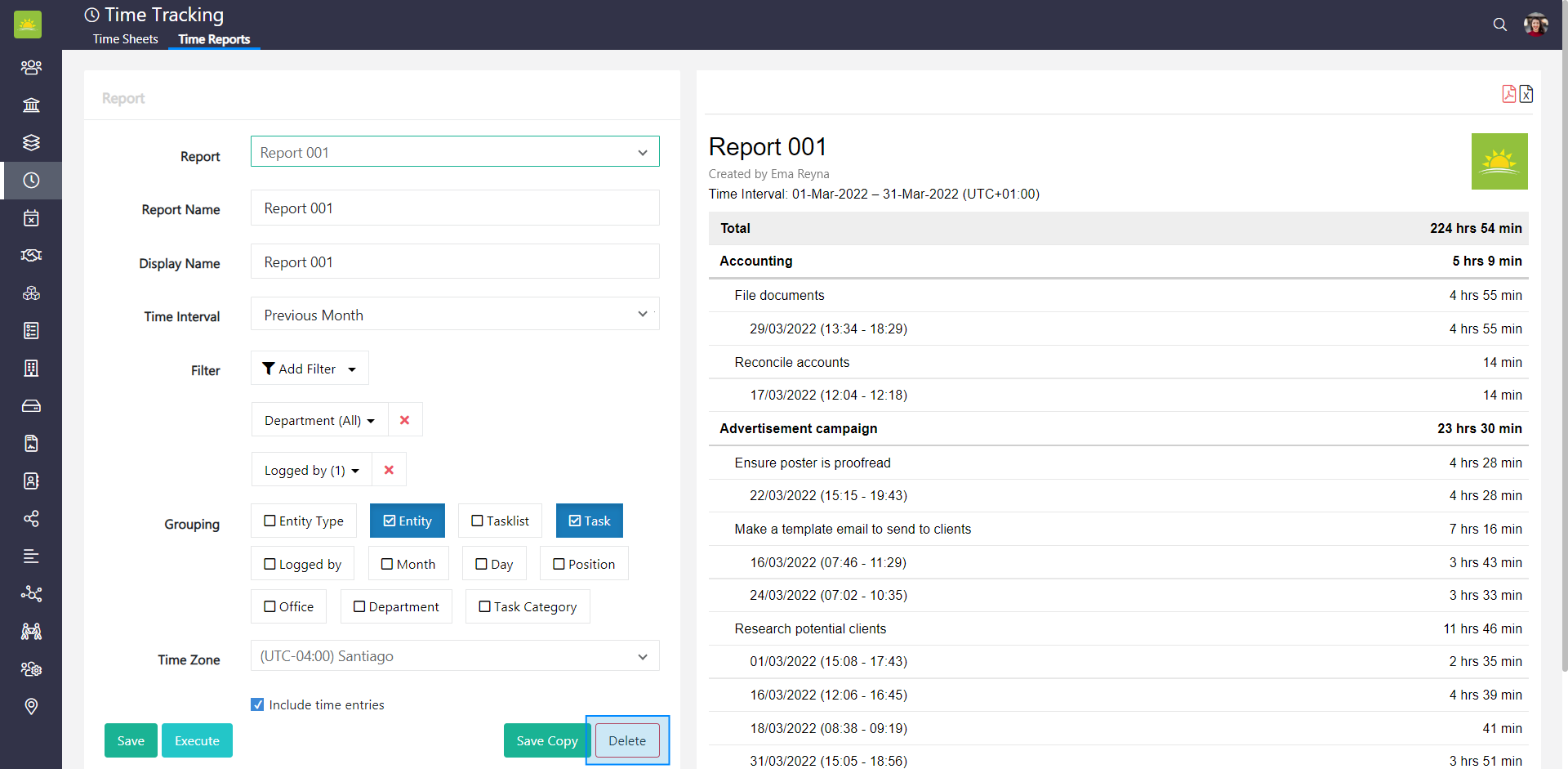 To delete a time report, go to the Time Tracking module and click the Time Reports tab.