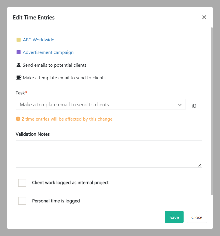 Update the relevant information and click Save. Clicking Close will take you back to the time tracking screen. The minimum and maximum length of the entry will be set up by an organization administrator.